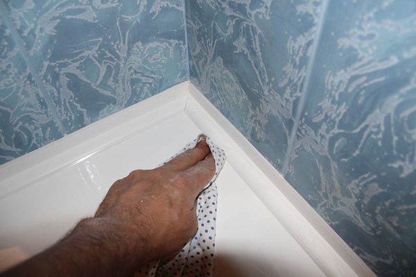 - Nettoyez soigneusement les surfaces de travail: essuyez le côté du bain, qui est près du mur, et le mur lui-même d'abord avec de l'eau, puis un dégraissant à base d'alcool et sec.