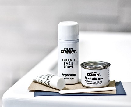 L'émail pour réparer les rayures et les copeaux est appliqué sur la surface endommagée avec une fine couche. 4 heures après séchage de la première couche, la peinture est appliquée une seconde fois. Vous pouvez utiliser la salle de bain après 24 heures.