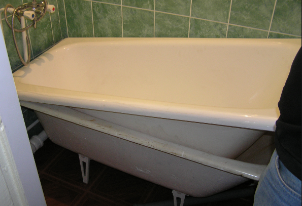 2. Installation d'une baignoire en acrylique dans une fonte. Baignoires en acrylique spéciales, faites à la taille de la fonte, et installées à l'intérieur.