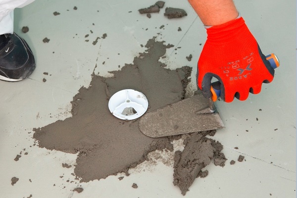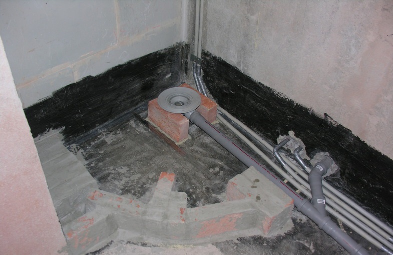 Après cela, nous faisons une chape rugueuse, mais nous posons d'abord la membrane d'étanchéité. Au lieu de cela, vous pouvez utiliser du mastic polymère-bitume, qui est soigneusement enduit de tous les coins, joints, joints et un côté de l'intérieur et de l'extérieur.