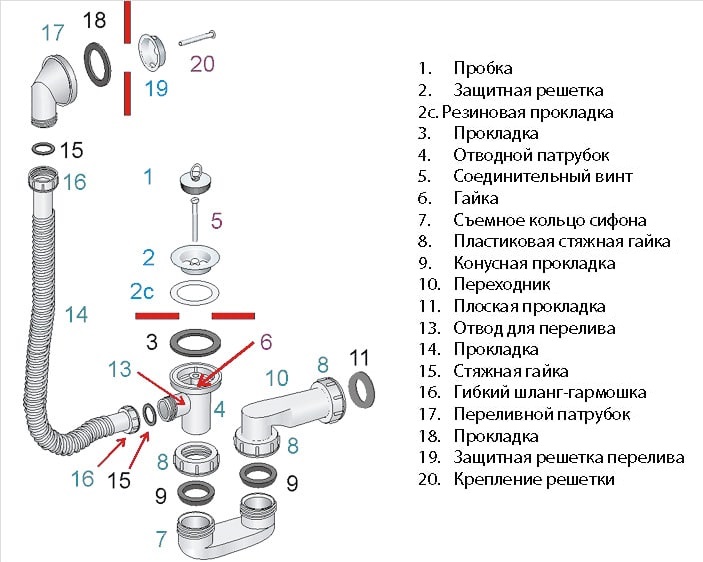 En règle générale, le siphon est livré non monté. Un grand nombre de pièces disposées de manière aléatoire peuvent même effrayer une personne qui a rencontré un raccord de baignoire au premier coup d'œil.Cependant, dans les instructions jointes, tout est décrit en détail et montre comment le siphon est assemblé, donc l'assemblage ne pose pas de difficultés particulières.