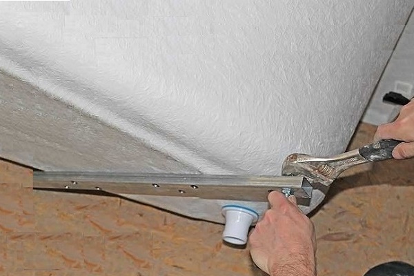 Lorsque tous les racks sont vissés, il est nécessaire d'aligner uniformément le cadre, en ajustant sa hauteur et en vérifiant la précision de l'installation avec le niveau du bâtiment. Ensuite, le cadre est vissé avec des vis sur la baignoire. Tout d'abord, le cadre est fixé à une plaque de fond renforcée, puis les paniers sont fixés dans les coins de la baignoire aux endroits où se trouvent des plaques encastrées.
