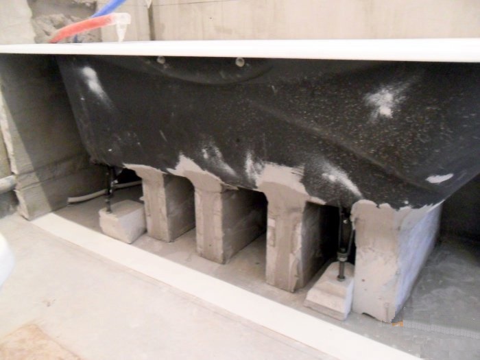 Les lodges sont installés. Maintenant, le bain doit être soigneusement posé sur la surface latérale et connecté aux vannes de vidange. Avant d'installer les vannes de vidange, n'oubliez pas de traiter soigneusement tous les joints qui seront utilisés avec du silicone.