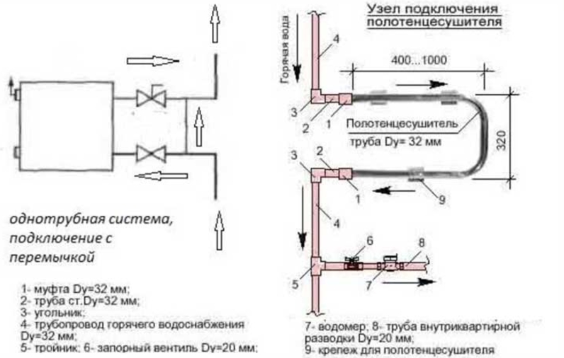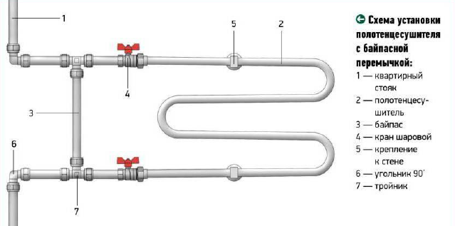 Pour faciliter l'entretien du sèche-serviettes, il est préférable de le monter sur un cavalier spécial - «bypass», et aussi d'utiliser vannes à boisseau sphérique pour rediriger le flux d'eau vers le cavalier.