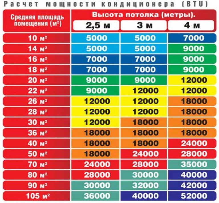 Sur la base de données tabulaires, pour les petites pièces jusqu'à 25 m2 les systèmes split d'une capacité de 7 ou 9 BTU conviennent, et pour les pièces spacieuses de 50 à 60 m2 il vaut mieux acheter avec un indicateur de 18, 24 BTU. Plus en détail, nous avons examiné la question du calcul de la puissance du système en cet article.
