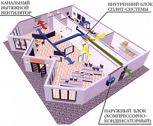 Souvent, ce type de climatiseurs de plafond est utilisé dans les supermarchés ou les grands bureaux où les plafonds sont suffisamment hauts et où il n'est pas nécessaire de sélectionner la température pour chaque pièce individuellement.