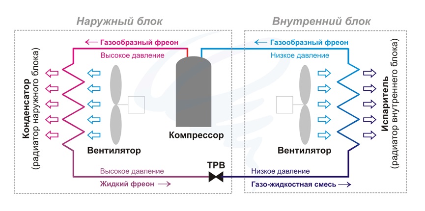 De plus, les masses d'air traversent l'échangeur de chaleur de l'évaporateur, où le processus de refroidissement a lieu. Le fréon est la substance active pour déplacer l'énergie thermique des flux d'air.