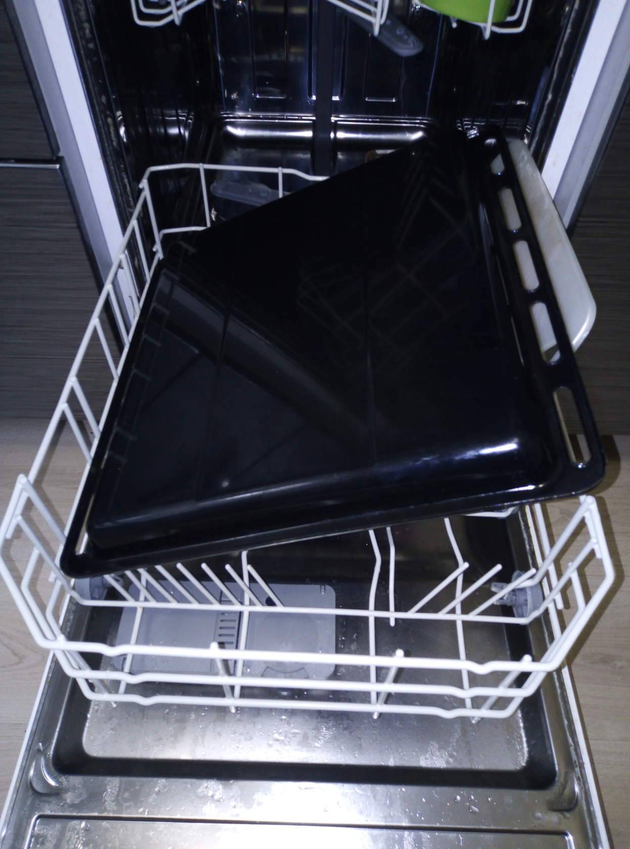 Bonjour Marina! J'ai les dimensions de la casserole 60 * 60 cm, et les dimensions du lave-vaisselle 50 * 70 cm, soit la casserole est 10 cm plus large que le PMM. J'ai mis la plaque à pâtisserie en biais (photo ci-dessous). Il est parfaitement lavé et à côté de lui, deux tasses / assiettes sont placées.