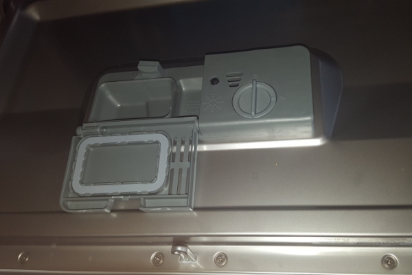 La conception externe et le contenu interne du modèle ressemblent à des analogues d'autres fabricants. La porte est à l'avant, s'ouvre à 90 degrés avec peu d'effort et sert de base pour le panier sous la vaisselle.