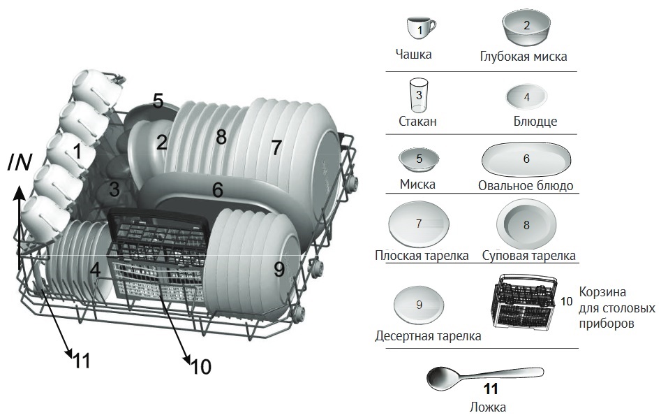 Une autre table représentative de la cohorte de lave-vaisselle compact contient les 6 ensembles traditionnels, y compris une paire d'assiettes, une paire de café ou de thé et des couverts. Pour terminer le cycle de travail, la machine aura besoin de 7 litres d'eau, elle consomme 0,61 kW par heure.Le niveau de bruit lors de l'exécution des opérations confiées est de 49 dB.