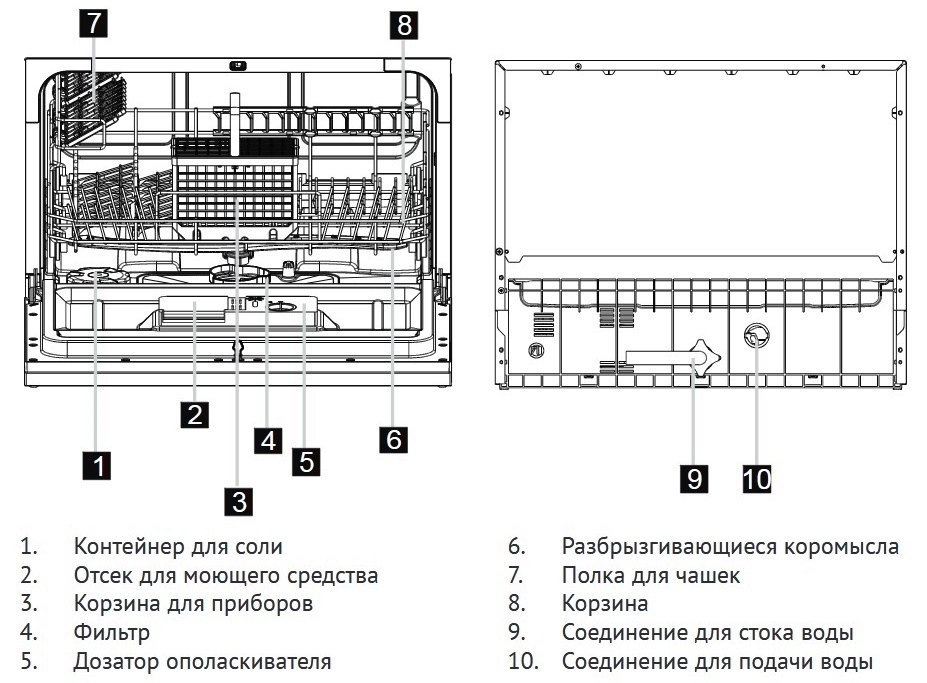 Le réservoir modèle compact contient 6 ensembles de plats cuisinés. Pour effectuer la procédure de nettoyage, elle aura besoin de 7 litres d'eau. Un mini-lave-vaisselle consomme 0,61 kW par heure. Le niveau de bruit pendant la période de lutte contre la pollution alimentaire est de 51 dB. Il est protégé des fuites par tous les moyens et dispositifs possibles.