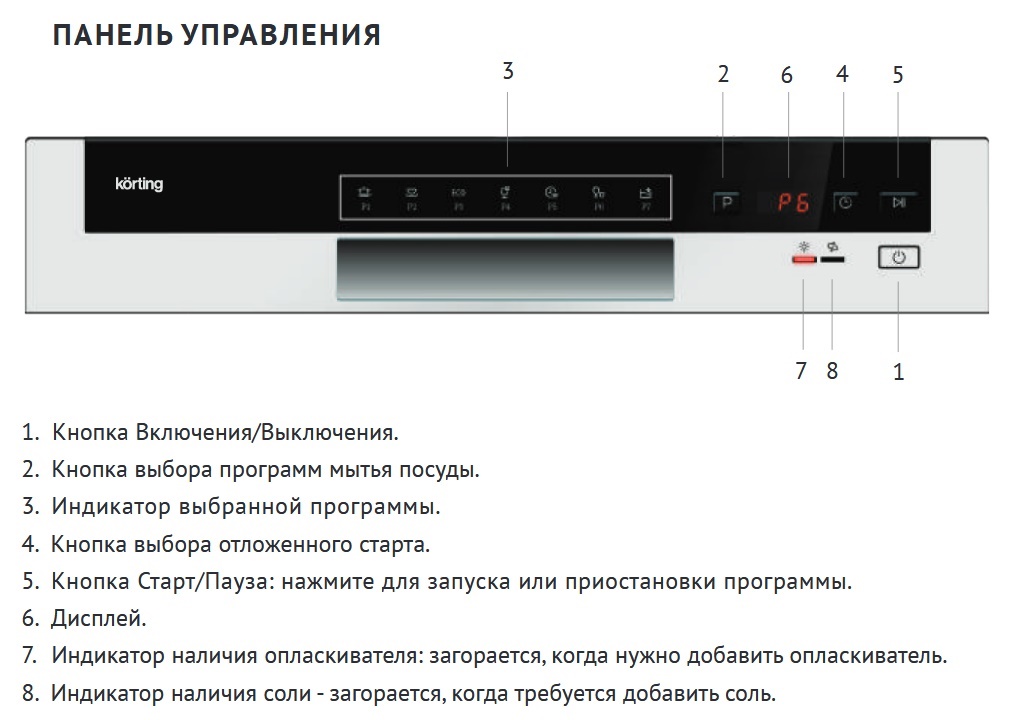 Utilisez les boutons pour démarrer ou éteindre la machine, sélectionnez le programme souhaité, utilisez l'option de démarrage différé. Le système d'affichage est très pratique, car il permet de surveiller cycle de lavage, chargez du sel à temps ou ajoutez du liquide de rinçage.