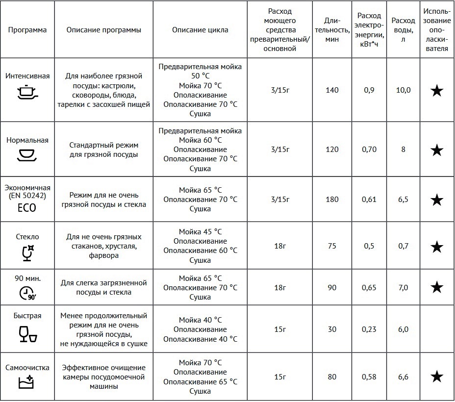 Le lave-vaisselle ne possède pas de capteur qui détermine les propriétés de l'eau du robinet, de sorte que les utilisateurs potentiels devront déterminer indépendamment les propriétés du liquide entrant dans la machine. Si nécessaire, prenez des mesures pour l'atténuer en sel régénérantnormaliser le pH initial.