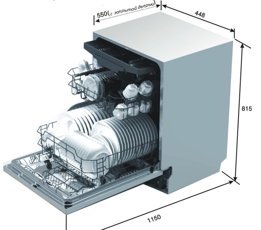 Le boîtier du lave-vaisselle est conçu pour être installé dans une armoire de taille spéciale. Les dimensions de la machine sont de 445 * 540 * 815 mm et le compartiment de montage est de 450 * 580 * 820 mm.