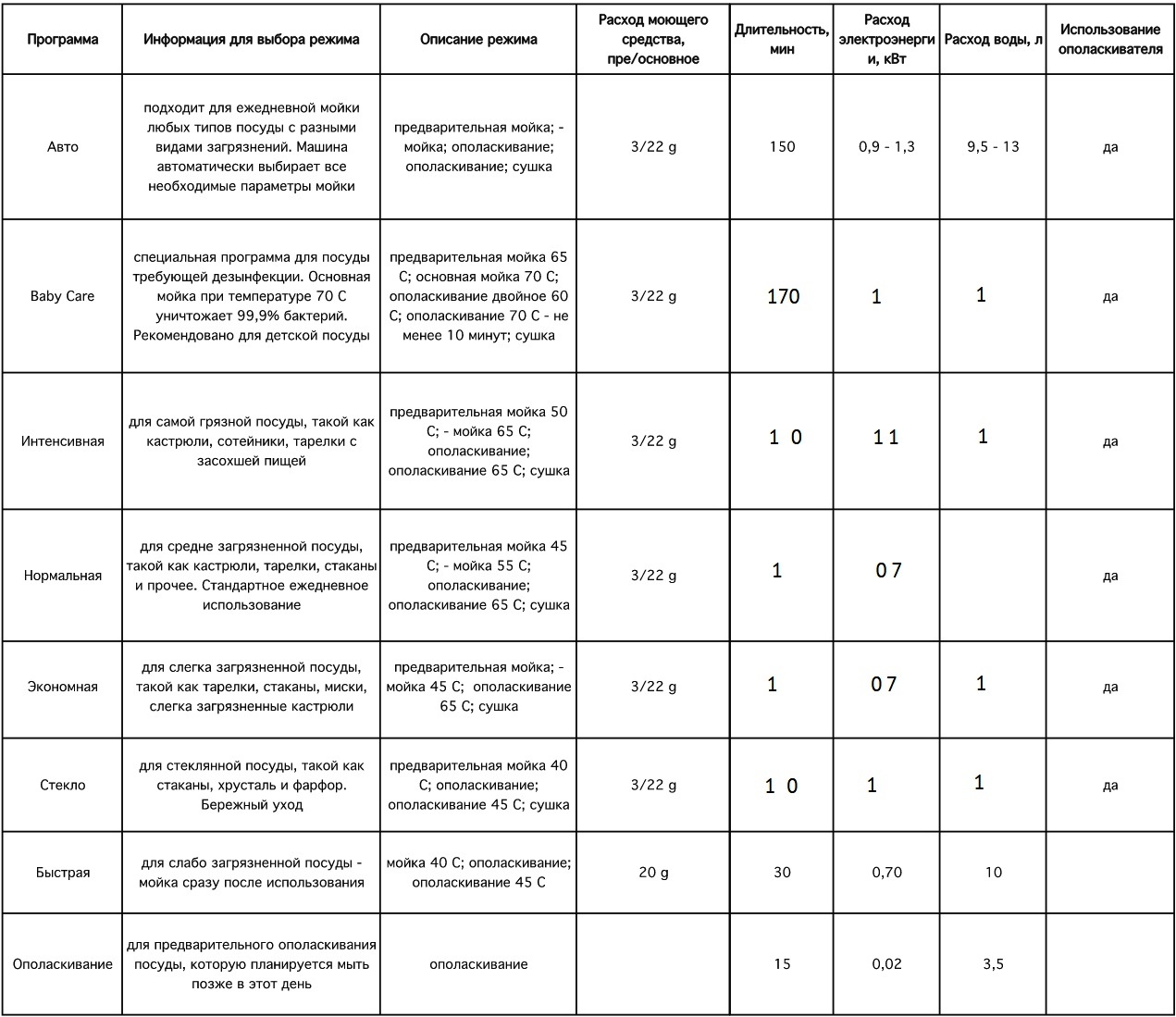Pour un lave-vaisselle moderne, 6-8 programmes ne sont pas rares. Leur présence vous permet de sélectionner la température souhaitée et cycle de lavage, orientez dans le temps, utilisez le maximum de possibilités pour nettoyer tel ou tel type de vaisselle.