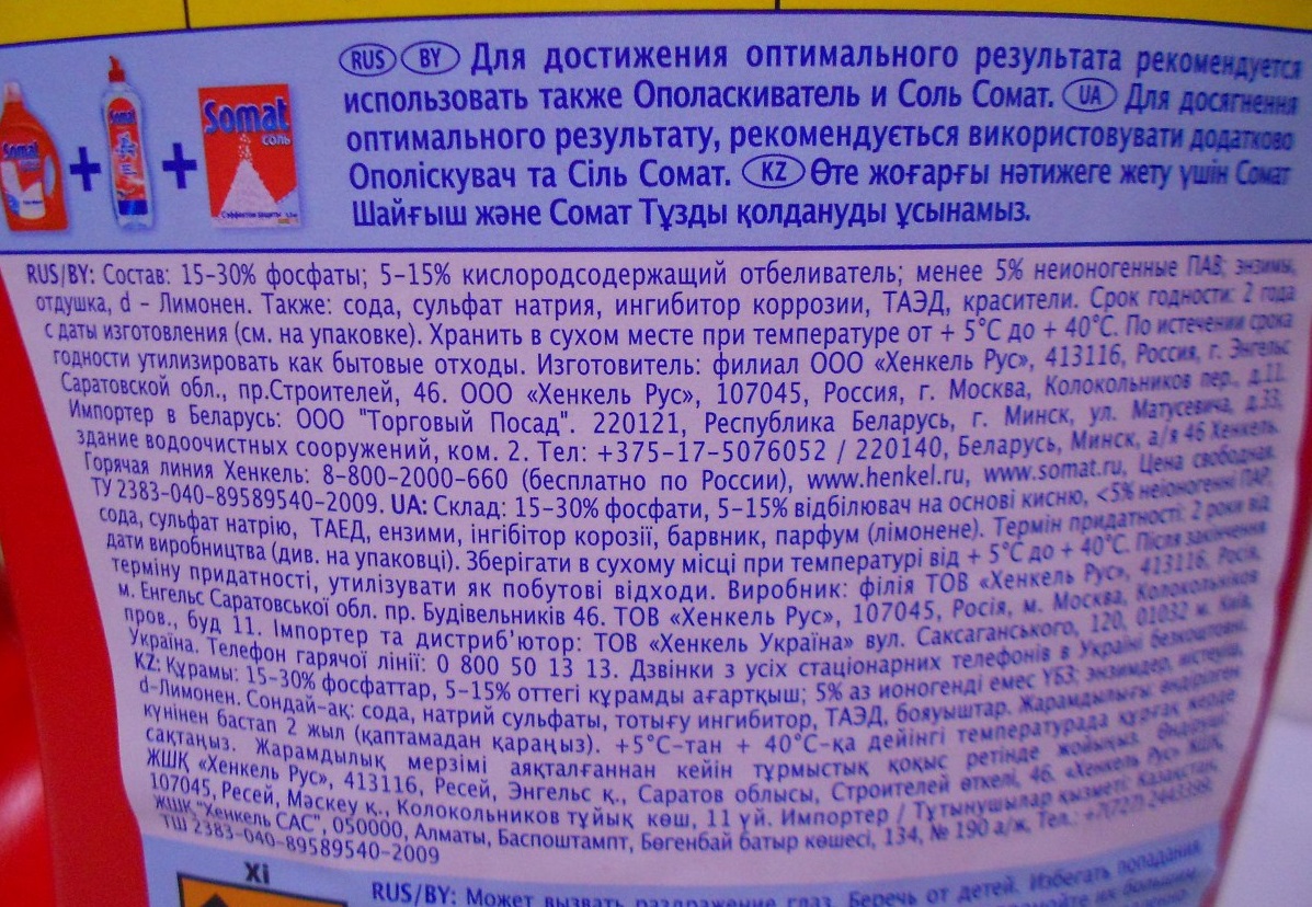 Le produit comprimé Somat comprend déjà à la fois du détergent lui-même et du sel avec un conditionneur, ce qui élimine le besoin de boîtes de bocaux supplémentaires. Mais si l'eau est dure, du sel doivent encore ajouter.
