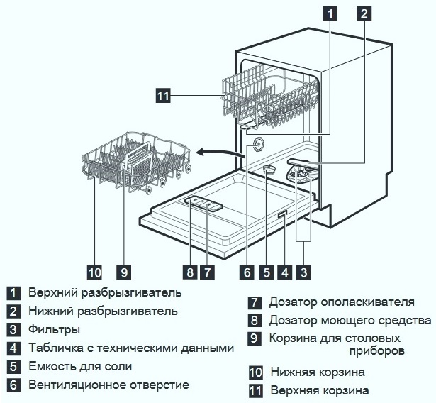 Equipement interne. La description des éléments structurels et des pièces amovibles donnera une idée de base du lave-vaisselle de l'appareil.