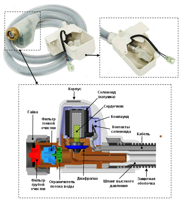 Le type électromagnétique Aquastop possède une valve électromagnétique. Il peut s'agir d'un ou deux, situés à la base du tuyau. De là, le câble d'alimentation longe tout le tuyau jusqu'au bornier, puis se connecte au schéma électrique du lave-vaisselle.