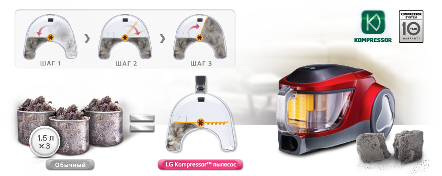 Tous les aspirateurs lg avec compresseur sont de type cyclone et disposent d'un système de dépoussiérage. Le reste de leurs caractéristiques varient considérablement, lors du choix, il convient de considérer ces points: