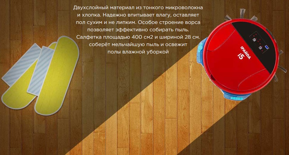 Le principe du nettoyage à sec du Panda i5 n'est pas différent des autres robots d'aspirateur - il aspire la poussière et les débris sur toute sa trajectoire, modifiant la puissance en fonction du niveau de pollution et s'aidant des brosses rotatives.