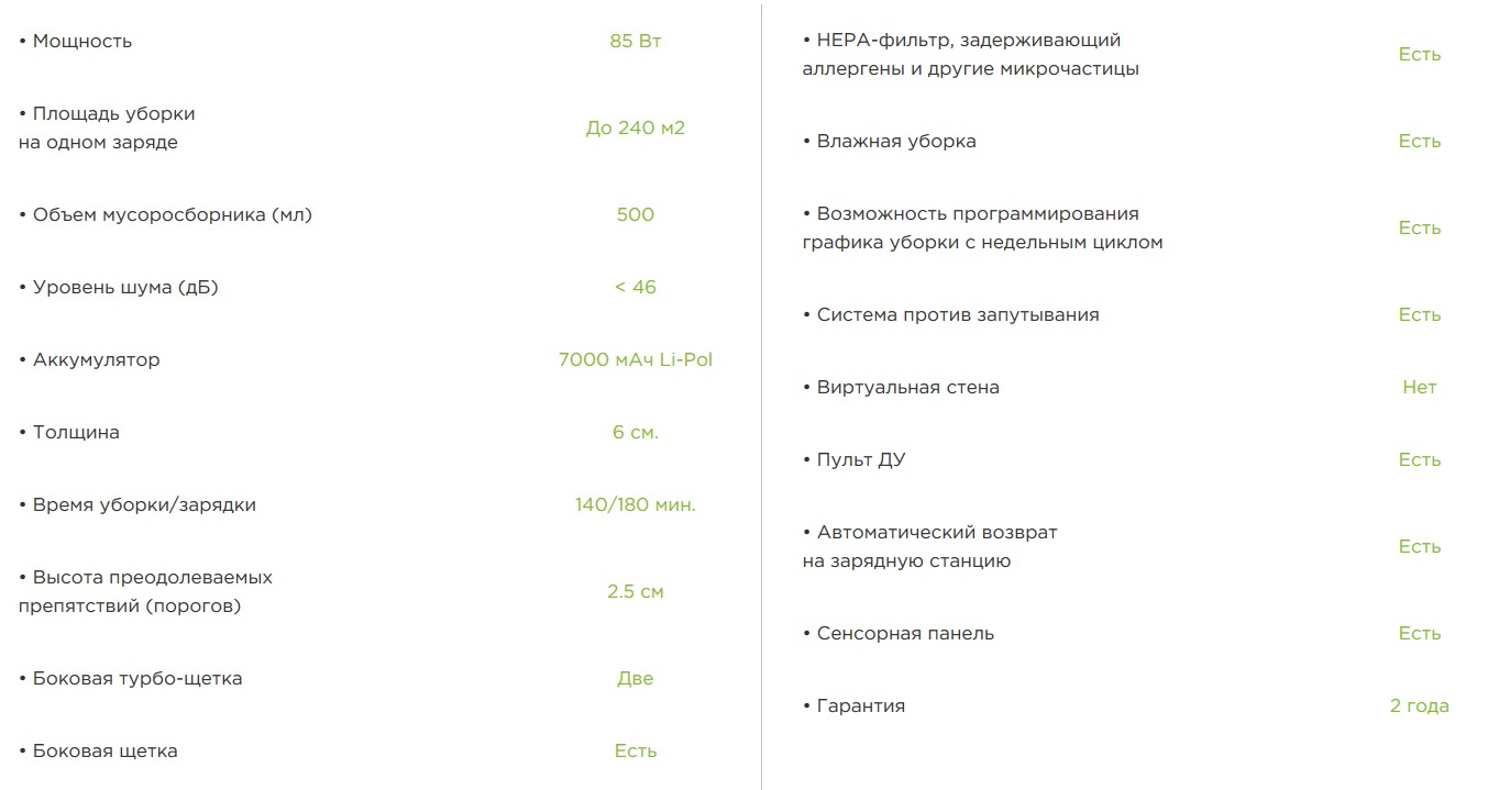 Cet aspirateur robot est également soumis à un nettoyage à la fois sec et humide. L'appareil est chargé pendant 3 heures, à partir de la batterie préparée pour le fonctionnement, il fonctionne pendant 1 heure et 20 minutes. Lorsque l'énergie reçue se termine, le nettoyeur automatique se précipite vers la base de stationnement. Si le processus d'amener la pièce a été interrompu, après avoir chargé le robot revient au point à partir duquel il est allé charger.