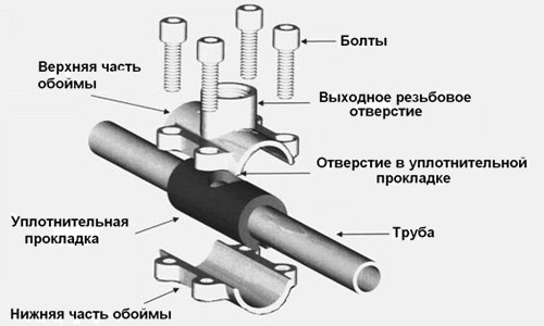 Dans certains cas, il est pratique de connecter le dispositif de lavage à un endroit spécifique dans un tuyau droit. Pour effectuer cette opération, vous aurez besoin d'un adaptateur spécial - une selle d'accouplement, qui est une pince d'un clip avec une sortie filetée.