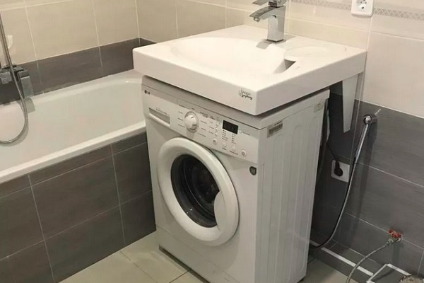 Cette méthode est fiable et simple, mais elle a un inconvénient important, car le tuyau avec lequel la plomberie est connectée à la laveuse est toujours en vue. Vous pouvez le masquer en disposant une boîte avec un pavage ultérieur.
