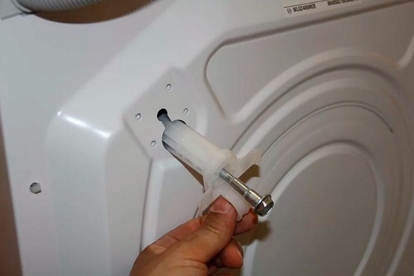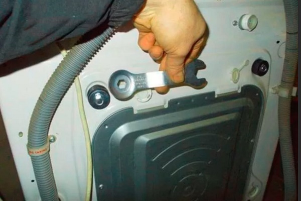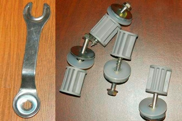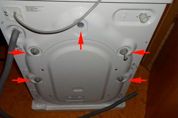 - Les boulons doivent également être retirés.qui sont installés à l'avant de la machine pour fixer le tambour. Il est préférable d'insérer immédiatement des bouchons en plastique dans les trous des éléments retirés (ils sont généralement inclus dans le kit de modèle).