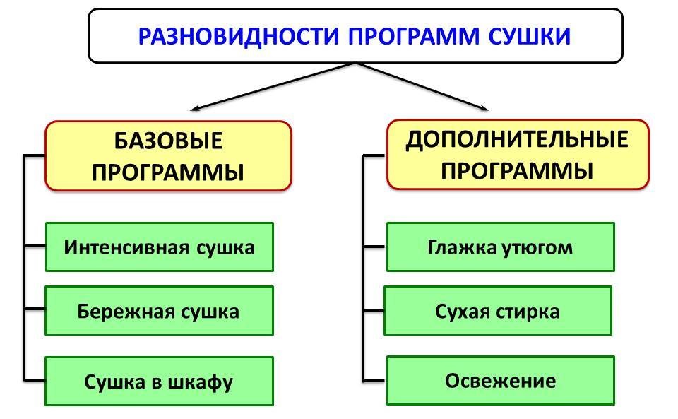 Deuxièmement, le degré de séchage dans les machines à laver a commencé à être contrôlé par des programmes spéciaux (plus précisément, il en est un, mais a des noms commerciaux différents).