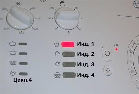 Après avoir sélectionné un programme, son exécution commence (en mode normal), mais dès qu'il s'agit de l'essorage (bien qu'il soit possible qu'il y ait un saut du rinçage à l'essorage, je pourrais le constater avec certitude), l'exécution du programme s'arrête et TOUS les indicateurs sur le panneau clignotent - à la fois une rangée verticale et un rayon horizontal de LED, avec une fréquence d'environ 2 Hz.