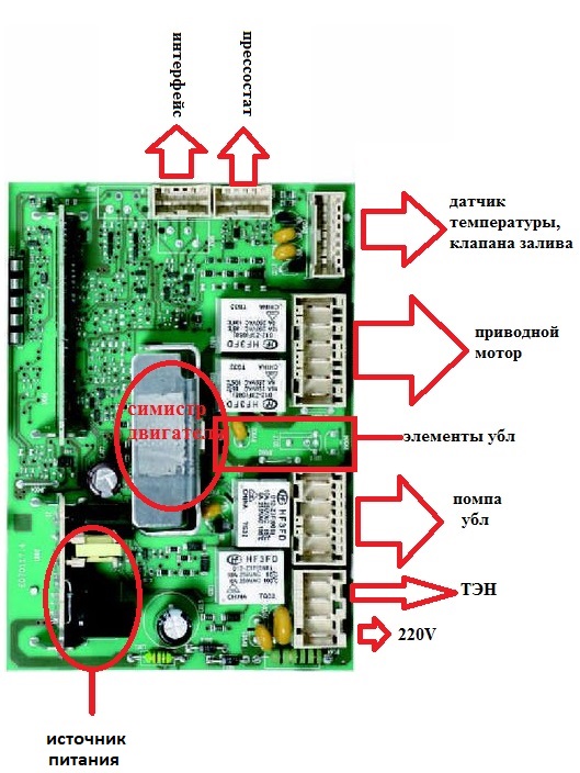 Le problème le plus courant est une panne du simistor contrôlant la vanne de remplissage, un élément par le signal duquel la machine commence à collecter de l'eau. Mais les chemins, les soudures, les grilles, les diodes, les relais ou les résistances dans le circuit de commande des vannes peuvent également brûler.