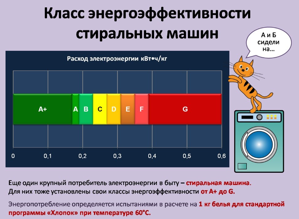 La consommation d'électricité des équipements de classe A +++ est de 0,5-0,6 kW / h. Ces classes sont calculées et indiquées séparément dans les spécifications techniques pour les modes de lavage et d'essorage.