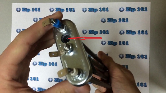 La spirale de travail elle-même est soudée par les extrémités sortantes aux contacts auxquels la tension d'alimentation est fournie pendant le fonctionnement. A proximité se trouve une unité thermique qui mesure le niveau de chauffage de l'eau dans la cuve de lavage.