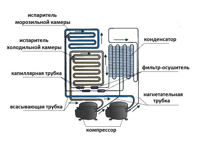 Le système de travail du réfrigérateur est rempli de fréon, qui se déplace continuellement à travers les tubes, changeant alternativement son état d'agrégation.