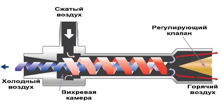 Dans les appareils de cette catégorie, il y a un compresseur.Il comprime l'air, qui se dilate davantage dans les unités installées des refroidisseurs à vortex. L'objet se refroidit en raison d'une forte expansion de l'air comprimé.