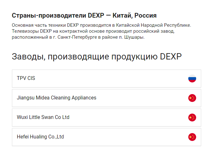 Oui, il y a une grande concurrence sur le marché des appareils électroménagers, donc les fabricants comme Dexp sont en demande. Soit dit en passant, si vous ouvrez la source officielle, vous pouvez voir qu'il existe une production en Russie et en Chine. Et Dexp produit également beaucoup de choses en plus des réfrigérateurs. Et ce dernier, soit dit en passant, dans le segment du budget donnera certainement des chances à des fabricants plus connus en termes de rapport qualité / prix. Et au cours des dernières années, Dexp et le segment intermédiaire se sont implantés.