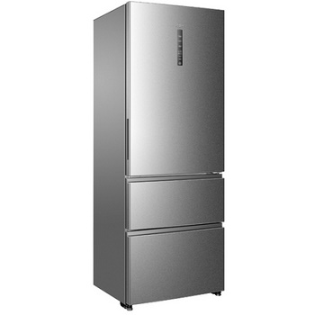 Un réfrigérateur argenté à trois compartiments avec portes françaises à charnières offre aux futurs propriétaires 508 litres d'espace utilisable, dont 157 litres tombent sur le congélateur.Le compartiment congélateur est situé au bas de l'unité, ce qui est pratique pour une utilisation fréquente.