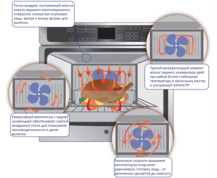 Fırını özel bir fan ve egzoz sistemi ile donatan geliştiriciler bir fonksiyon ekledi zorlanmış konveksiyon sıcaklık farklarını ortadan kaldırmak için.İyileştirme sayesinde, örneğin kameranın hızlı bir şekilde ısıtılması, eşit kızarmış bir kabuk elde edilmesi ve hatta tasarruf gibi çeşitli yeni özellikler ortaya çıktı.