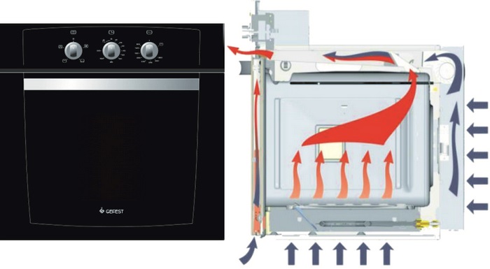 Modern modellerde, kızartma brülörlerinden biri, kabinin üst kısmında bulunur ve bu da her taraftan ürünlerin pişirilmesine katkıda bulunur. Üst düzenleme, ızgara fonksiyonlu fırınların da karakteristiğidir.