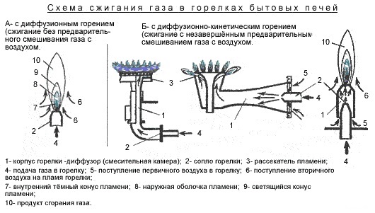 Ev aletlerinde alev enjeksiyonlu çok torçlu brülörler kullanılır. Herhangi bir gaz sobasının çalışma prensibi, yakıtın hava ile karıştırılmasından sonra meydana gelen yanma sürecine dayanır.