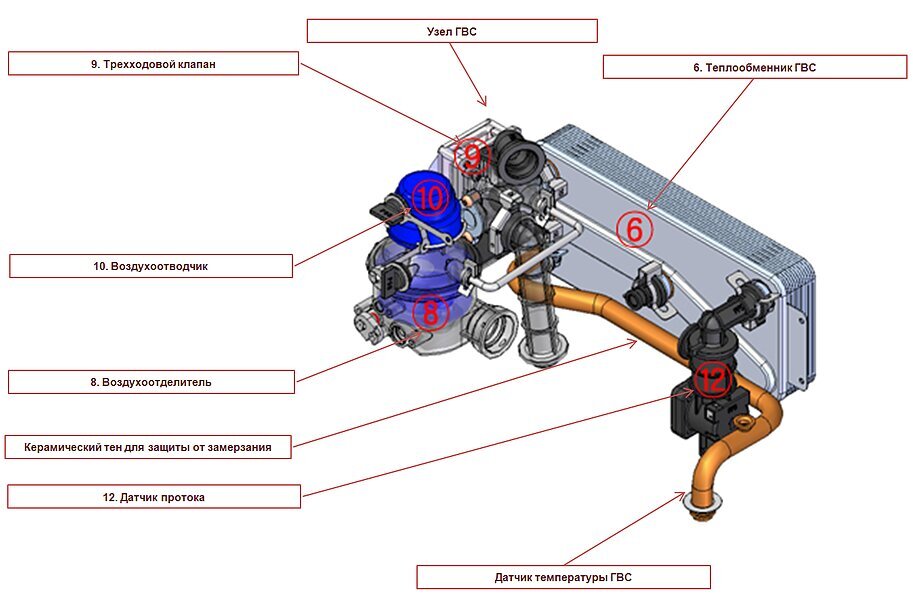 Memenin üstünde bakır plakalı ana ısı değiştirici bulunur.Bakır ve paslanmaz plakalardan oluşan ikincil bir tane aşağıda yer almaktadır, sıcak su tedarik sistemini ısıtmak için kullanılır ve üç yollu bir vana takılır.