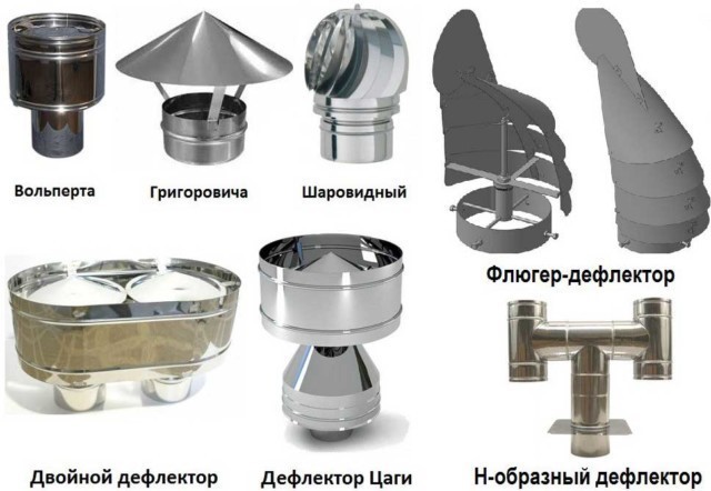 Özel evler, evler ve saunalarda bacalar için kullanılan en yaygın deflektörler: TsAGI, yuvarlak "Volper", H-şekilli, yıldız şekilli "Shenard", Grigorovich ve açık Astato.