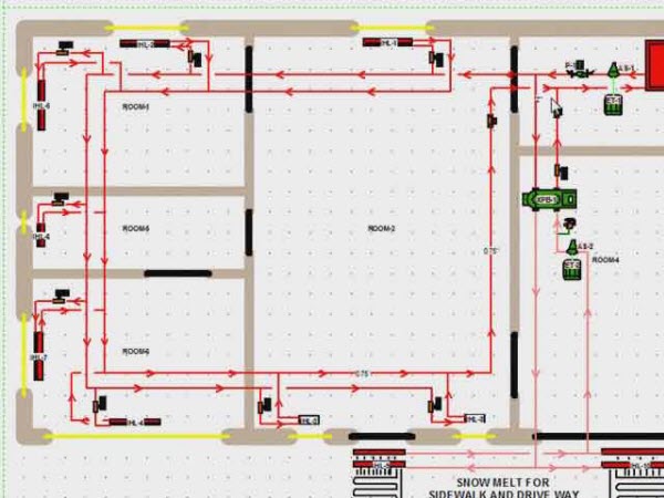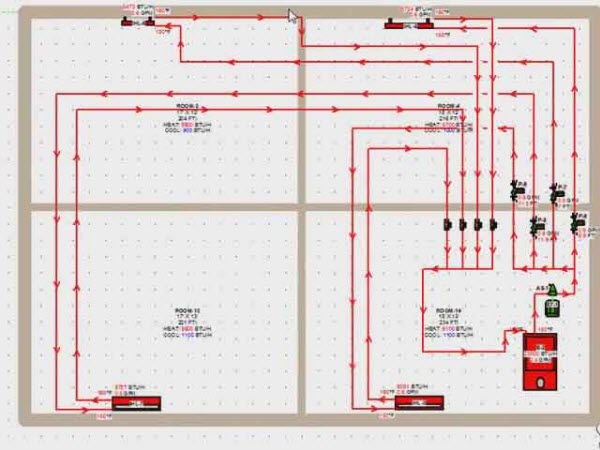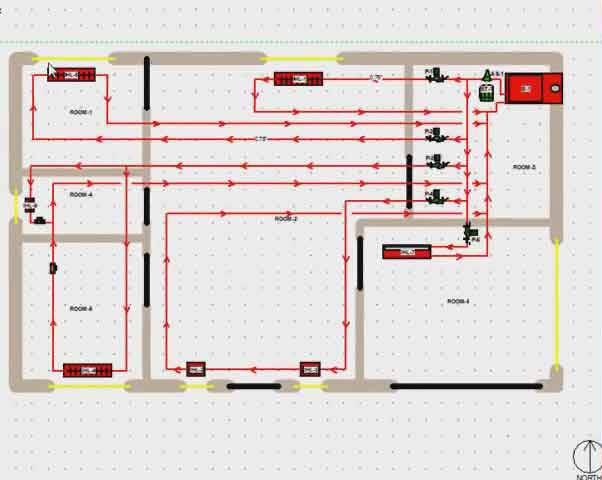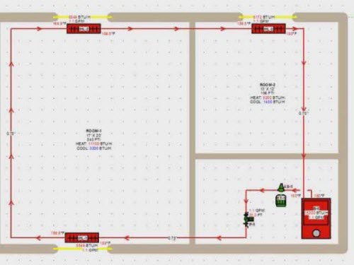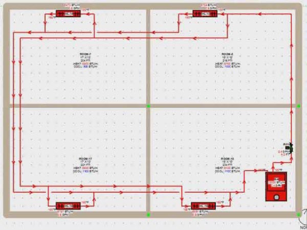 Aşağıdaki şemada, ısı borusunun odaların her birinde kıvrımları vardır. Yani, her oda ayrı bir devre ile ısıtılır.