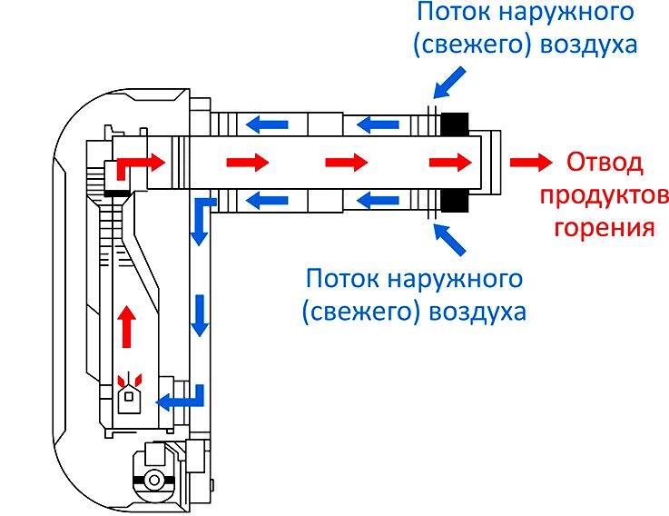 Yatay olarak yerleştirilmiş ve duvardaki bir delikten çıkan koaksiyal bacalar, kapalı tip bir yanma odasına sahip cihazlara uygulanır.