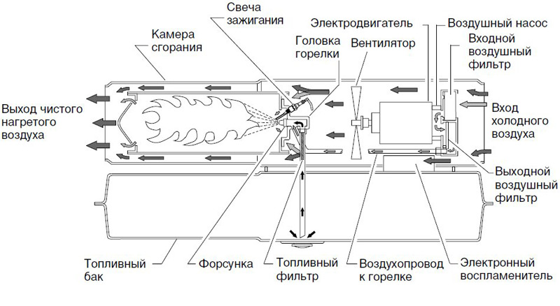 Dolaylı ısıtma tabancaları. Zehirli yanma ürünleri özel bir prize düşer ve zaten temizlenmiş hava odaya girer.