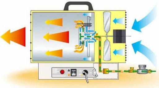 Direkt ısıtma tabancaları. Fan brülöre hava verir, ardından odaya beslenir. Sıcak hava kütleleriyle birlikte gaz yanma ürünleri de yayılır. Sıvı yakıt yakılarak elde edilen maddeler kadar tehlikeli değildir, ancak yine de zehirlenmeye neden olabilirler.