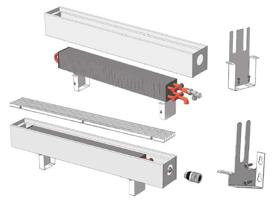 Zemin konvektörü, 1-2.5 m uzunluğunda uzun bir galvanizli gövdeye sahiptir.İçinde bir veya daha fazla boru, bir ısı değiştiricinin işlevini yerine getiren koruyucu bir kasaya yerleştirilir. Pirinç veya bakırdan yapılmış ve alüminyum levhalara bağlanmıştır. Bu malzemeler bir nedenden dolayı seçilir - hızlı bir şekilde ısınır ve ısı verir.