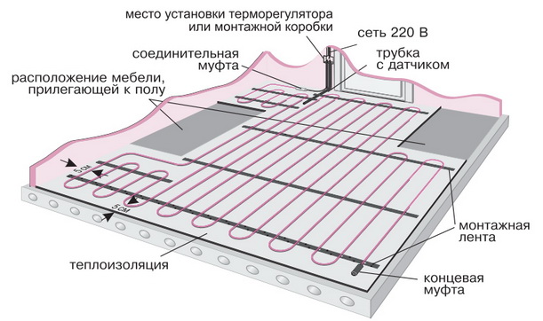 Tasarım aşamasında, aşağıdakiler için uygun bir yer düşünmelisiniz: termostat yerleşimi. Bazı durumlarda, zemin sistemini düzenlerken, gerekli gücün ayrı bir elektrik kablo hattının döşenmesi gerekir.