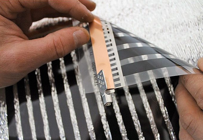 Bir karbon filmi döşerken, bağlantı kontaklarının termostatı asması gereken yöne yönlendirilmesi için bakır elemanlar aşağıya yerleştirilmelidir.Filmin arka tarafındaki kesiklerin yanı sıra elektrik tellerinin bağlantı noktası bir bitüm yalıtım tabakası ile kaplanmalıdır.