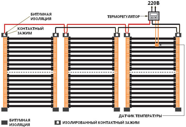 - Bakır plakaların kenarlarına terminal kelepçeleri takarak, bunları elektrik kablolarına bağlayın. Birleştirilmiş sistem bir oda termostatı ile bağlanır, daha sonra tüm plakaların ısıtma homojenliği kontrol edilir.